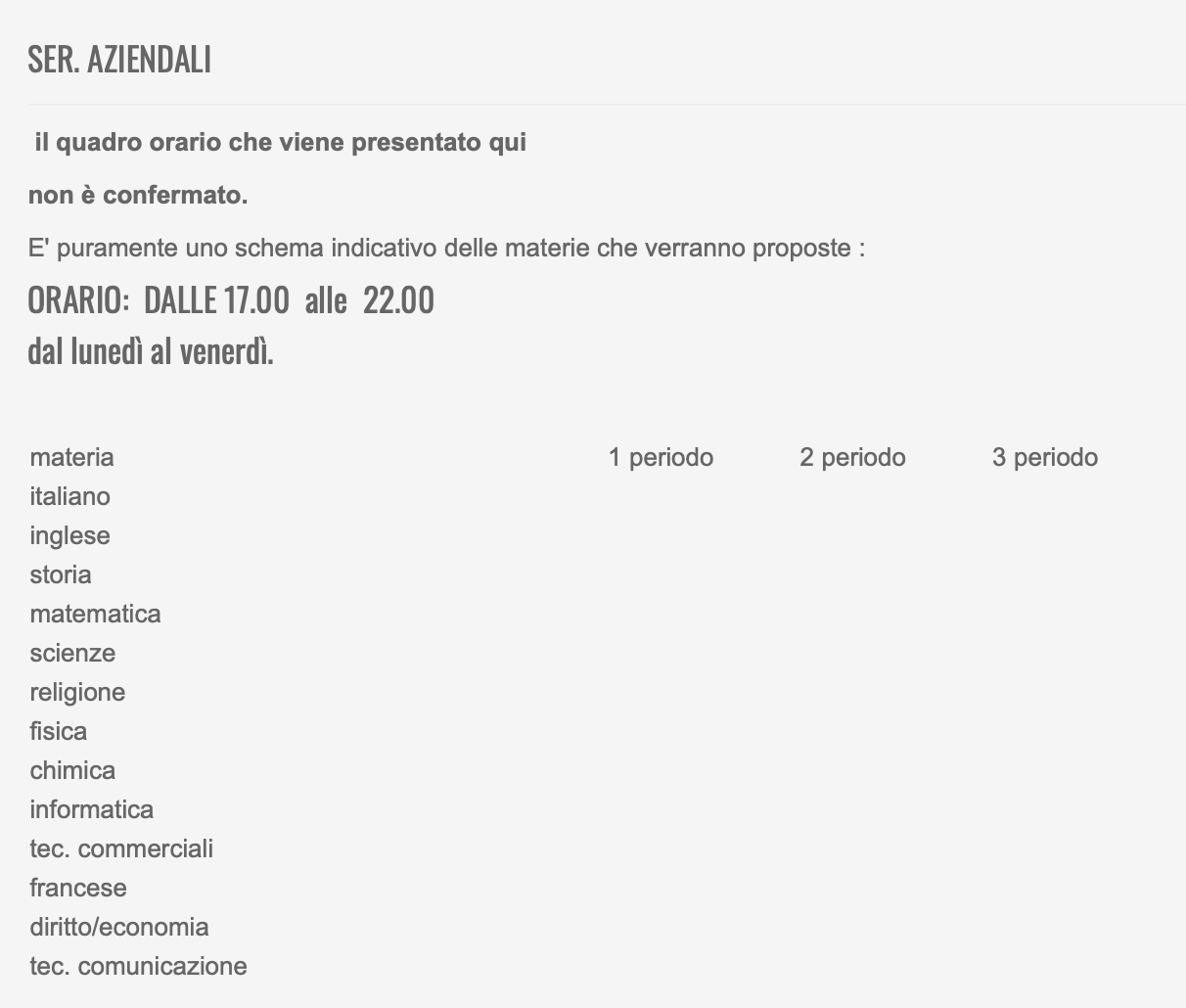 Durata: un anno. Durante lo svolgimento del primo anno scolastico saranno affrontate le materie che corrispondono al primo e secondo anno.